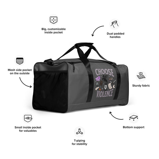 Get ready to show off your fandom love every day with the Choose Violence duffle bag from our Bookish Collection. Perfect for gym goers, Fourth Wing fans, and all fandomaniacs, this bag is sturdy, spacious, and stylish. Gear up for your next convention in style!