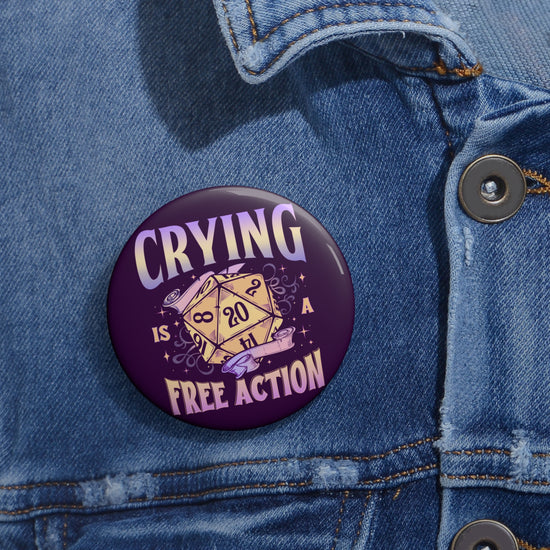 Elevate your style and show your love for fandom every day with our Crying Is a Free Action pin! Perfect for all Fandomaniacs and Dungeons and Dragons enthusiasts, this pinback button is a must-have accessory to add some character to your everyday look.