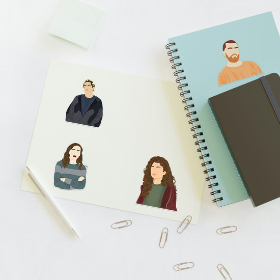 Euphoria fans we have stickers. Our Euphoria sticker set 1 features, Rue and Dom just to drop a couple of names. Available in white, holographic, and transparent versions to choose from.