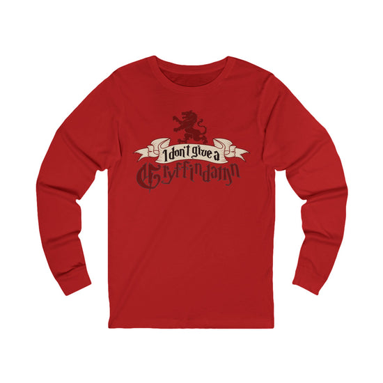 Stand out from the crowd with the "I Don't Give A Gryffindamn" Unisex Long Sleeve T-Shirt, inspired by the iconic Gryffindor house from the Harry Potter series. Available in sizes XS to 2XL, this t-shirt is perfect for all Fandomaniacs looking to show their love for their favorite fandom every day. Made from lightweight and comfortable material, this shirt is ideal for casual wear or lounging around the house. Don't miss out on the chance to add this unique design to your collection from Fandom-Made.com.