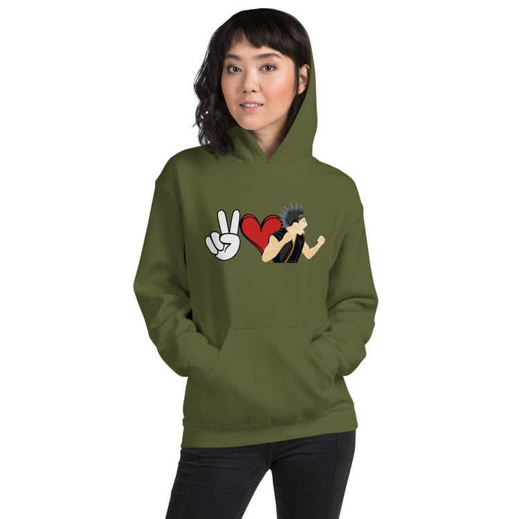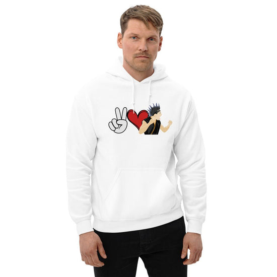 Everyone needs a cozy go-to hoodie to curl up in, so go for one that's soft, smooth, and stylish. Let that hoodie be our Peace Love and Hawk hoodie. It's the perfect choice for cooler evenings! It's also great for showing your love for the streaming series Cobra Kai. The design is showing the love for Eli 'Hawk' Moskowitz (Jacob Bertrand).