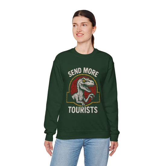 The Send More Tourists Unisex Sweatshirt from Fandom-Made.com is the perfect way to show your love for the Jurassic Park films every day. Available in sizes S to 4XL, this comfortable sweatshirt is a must-have for all Fandomaniacs. Makes a great gift for yourself or a fellow fan - because true fans know how to showcase their fandom pride without saying a word. flair.