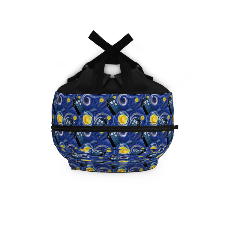 Elevate your everyday style with the Tardis Night backpack, designed for the ultimate fandomaniacs. With its stunning all-over print inspired by Vincent Van Gogh's Starry Night, this backpack is a true masterpiece that allows you to carry your love for Doctor Who wherever you go. Whether you're a die-hard Whovian or simply appreciate art and science fiction, this backpack is a must-have for anyone looking to show off their unique style and passion for the beloved TV series. Stand out from the crowd and make a statement with this one-of-a-kind backpack.