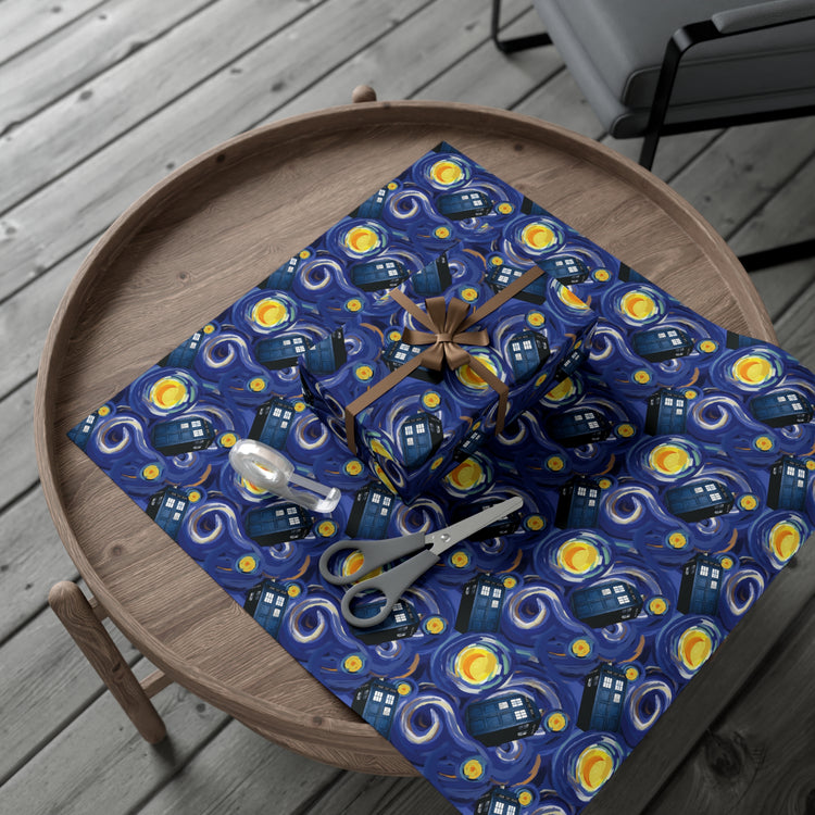 Elevate your gift-giving game with our Doctor Who-themed Tardis Night gift wrap. Featuring an all-over print inspired by Van Gogh's Starry Night, this wrapping paper is perfect for die-hard fans of the iconic sci-fi series. Show your love of fandom every day with this unique and eye-catching design that is sure to impress any recipient.