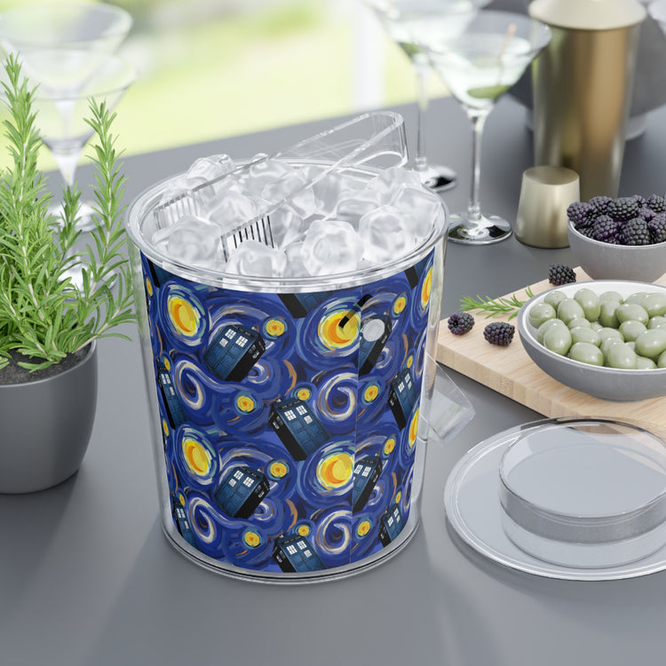 Unleash your inner Whovian with our Tardis Night ice bucket with tongs! This unique product features an all-over print combining Doctor Who with Van Gogh's Starry Night, perfect for showcasing your love of the beloved show. Whether you're hosting a Doctor Who-themed party or simply want to add a touch of fandom to your home, this ice bucket is a must-have for all fandomaniacs. Get yours today and show your love of fandom every day!