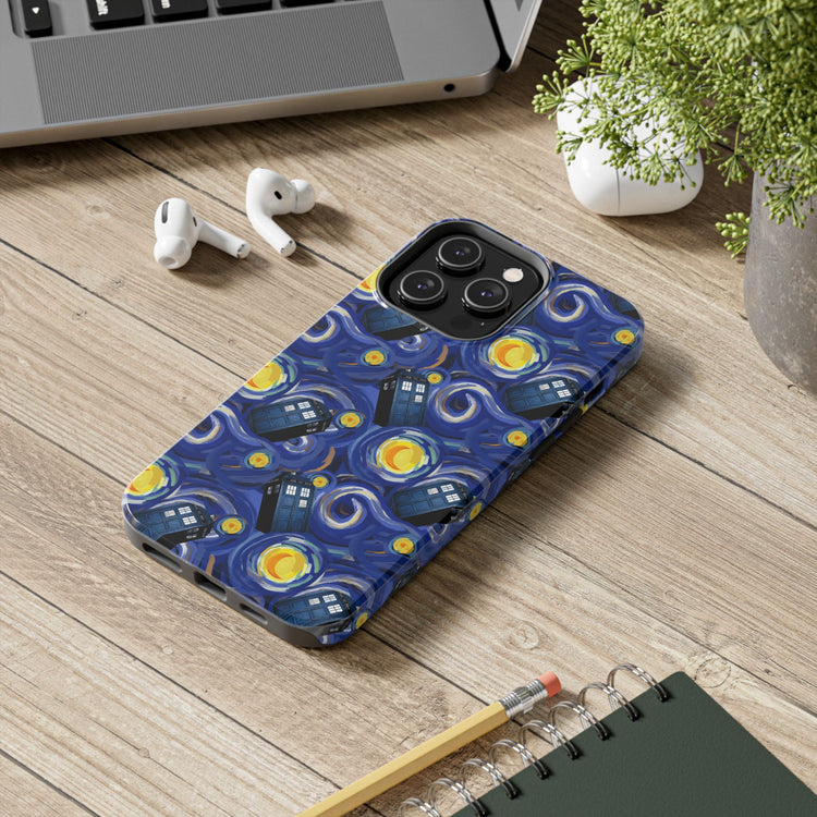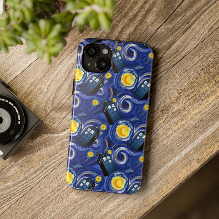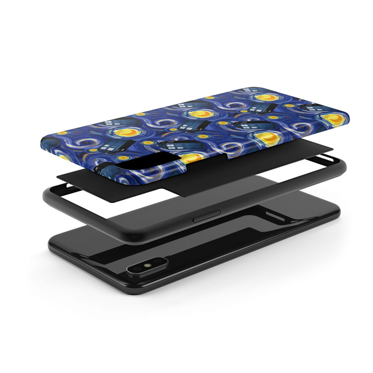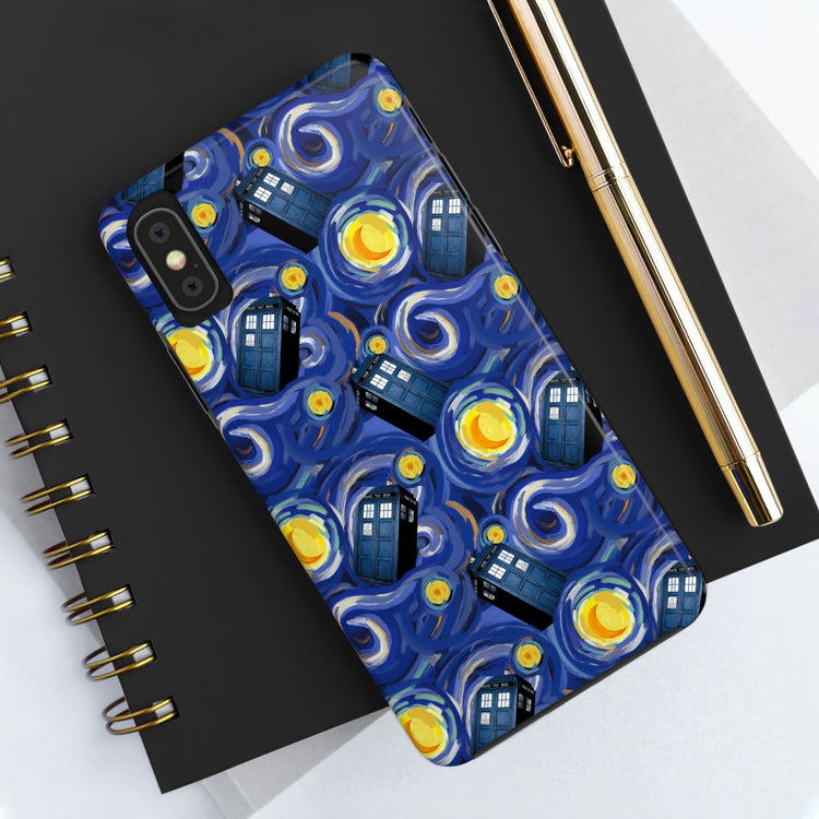 Indulge your inner fandomaniac with our Tardis Night phone case! This Doctor Who-inspired accessory features an all-over print that will transport you to another dimension every time you use your phone. Show your love of the show and the famous painting Starry Night with this unique case that is perfect for everyday use.