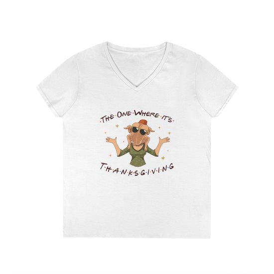 Elevate your Friendsgiving style with The One Where It's Thanksgiving Ladies' V-Neck Tee from Fandom-Made.com. This exclusive tee is a must-have for all fandomaniacs who want to show their love for Friends every day. Available in sizes S to 3XL, this tee is inspired by the iconic Thanksgiving episodes of Friends. Get yours today and celebrate the holiday in true fan style!