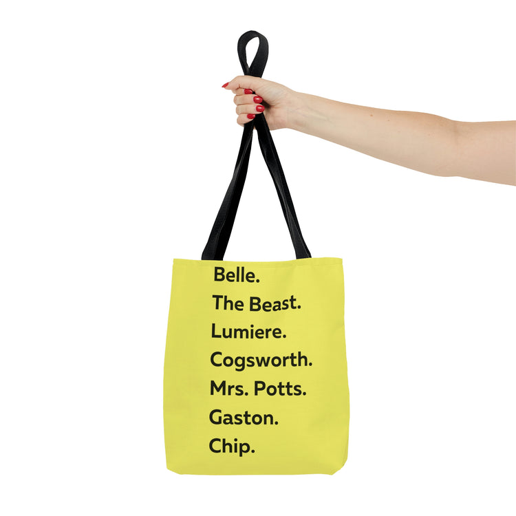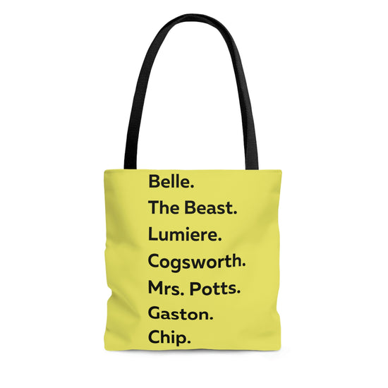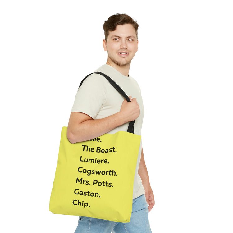 Show your Disney side with our Beauty and the Beast tote bag. This practical, high-quality Tote Bag is available in three sizes. The double-sided yellow bag has the names of all the wonderful characters on one side and the rose on the other. Made from reliable materials, lasting for seasons.