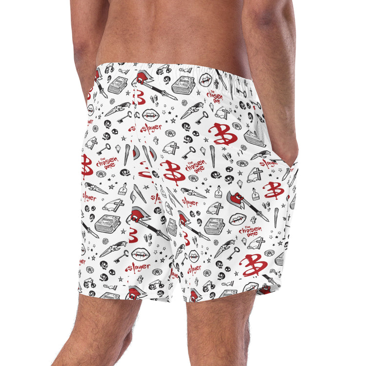 Look fang-tastic in our Buffy All-Over Print Swim Trunks! Made from recycled materials, these swim shorts are perfect for any die-hard Buffy the Vampire Slayer fan. Get ready to slay the beach in style.