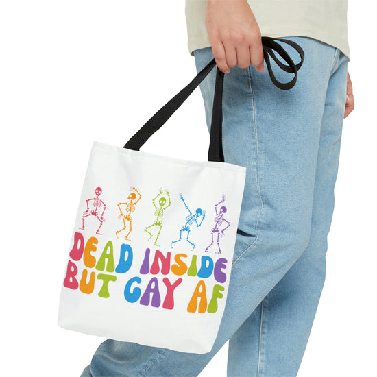 Carry your Pride with the Dead Inside Tote Bag featuring rainbow skeletons. Perfect for showing off your identity and style. "Dead Inside But Gay AF"!