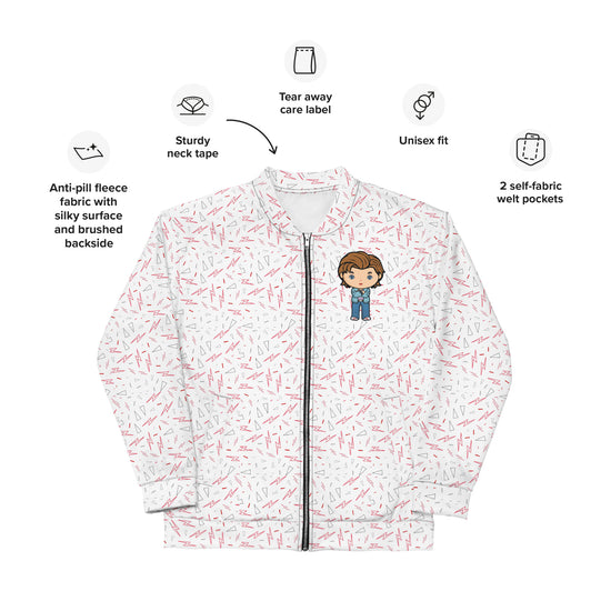 Are you a die-hard Stranger Things fan? Well, we've got the perfect jacket for you! Introducing the Dibs on Steve Harrington bomber jacket featuring a chibi of Joe Keery as Steve on the front left chest. On the back, you can "call dibs" on your fave babysitter in style. The flat-to-the-touch embroidery design adds a touch of sophistication to your fandom obsession. Show your love for the show every day with this must-have piece for all you fandomaniacs out there!