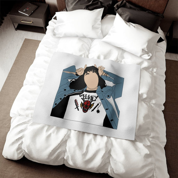 Cuddling with your favorite Stranger Things character is easy with our Eddie Munson (Joseph Quinn) blanket. Stranger Things fans will love the feel and design of this blanket for years to come. This sweatshirt blanket is exactly what happens when a blanket is made to feel like your softest, most favorite sweatshirt ever. Made 100% with jersey-knit polyester sweatshirt material, this blanket takes that warm feeling to the max. Made for snuggles, this heavyweight blanket now only needs your custom art to become an instant favorite for colder days.