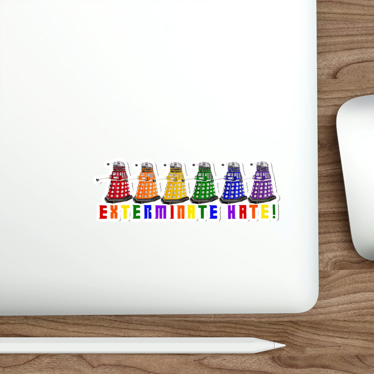 Our Doctor Who, "Exterminate Hate," die-cut stickers are great for both indoor and outdoor use as they are made with thick, resistant, laminate vinyl material.
