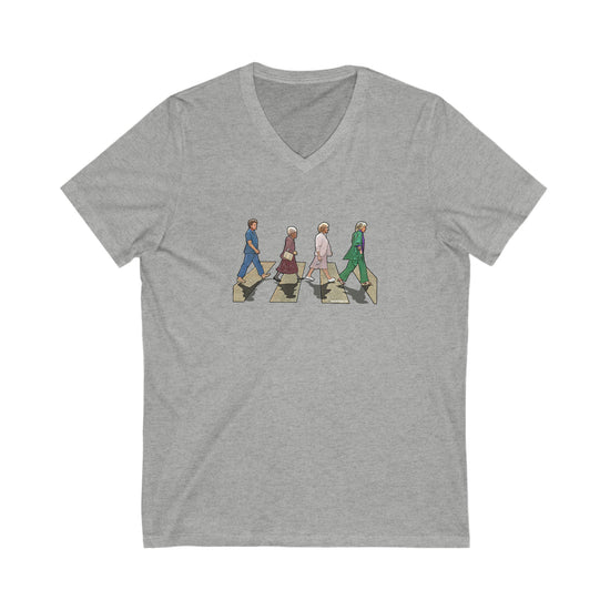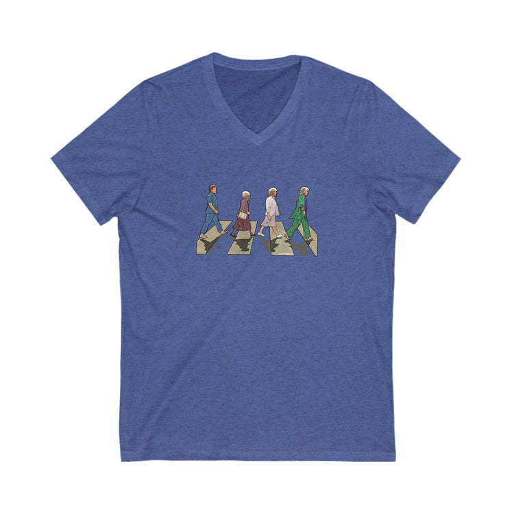 Looking good on both men and women, this Golden Girls-inspired soft jersey tee is comfortable enough to wear all day long. The front of the shirt is The Golden Girls (Blanche, Sophia, Rose, and Dorothy) walking across Abbey Road.