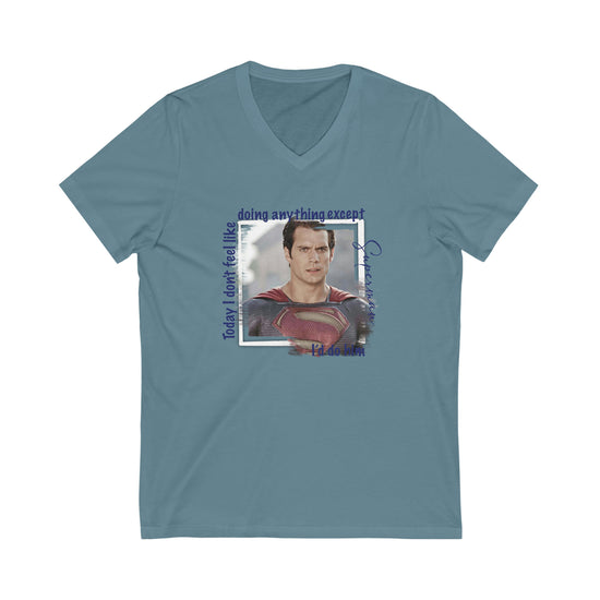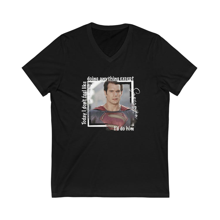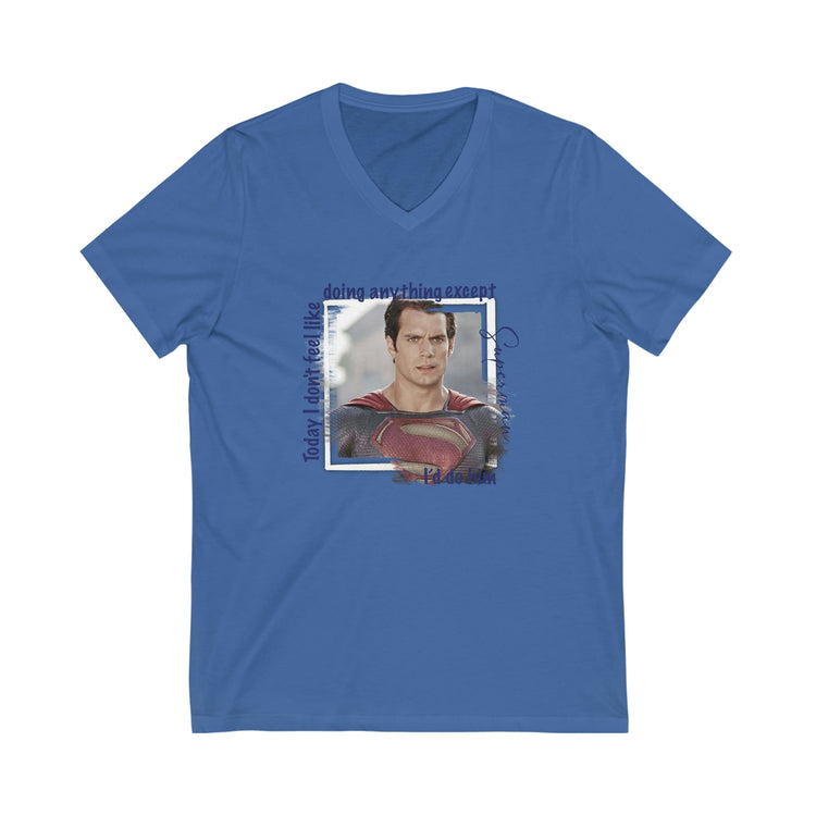 Superman fans we got the designs you've been wanting. Our soft jersey tee is comfortable enough to wear all day long. The front of the v-neck t-shirt has Henry Cavill as Superman with the phrase, "I don't feel like doing anything today, Except Superman, I'd do him."