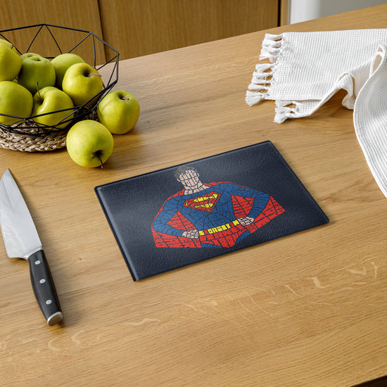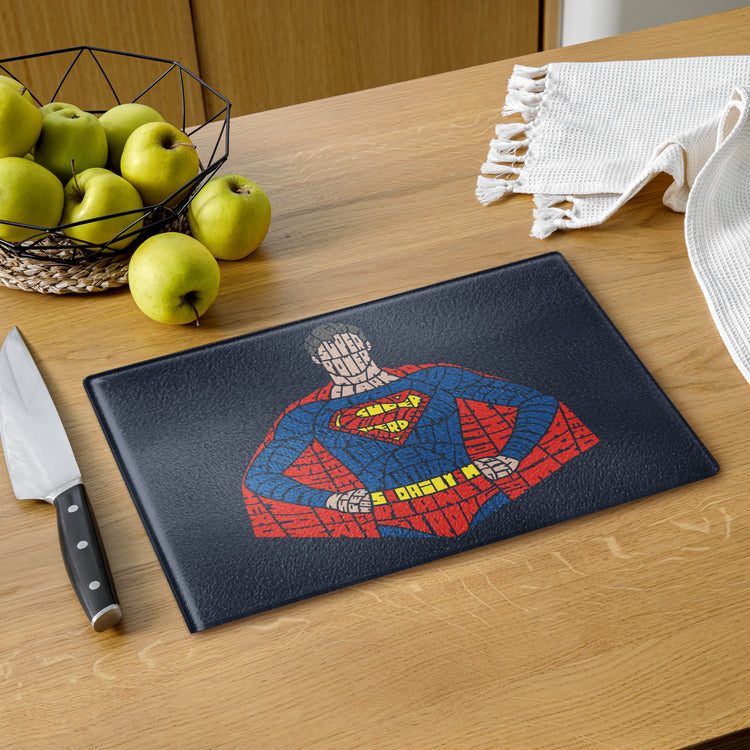 Elevate your kitchen with a touch of DC fandom with the Kryptonian Calligram glass cutting board. Made for true fans by Fandom-Made.com, this cutting board showcases a Superman Calligram in stunning detail. Choose from two sizes, 8" x 11" or 11" x 15", and show your love for fandom every day. Perfect for DC fans and fandomaniacs alike, this cutting board is a must-have for those who appreciate the art of everyday kitchen essentials.
