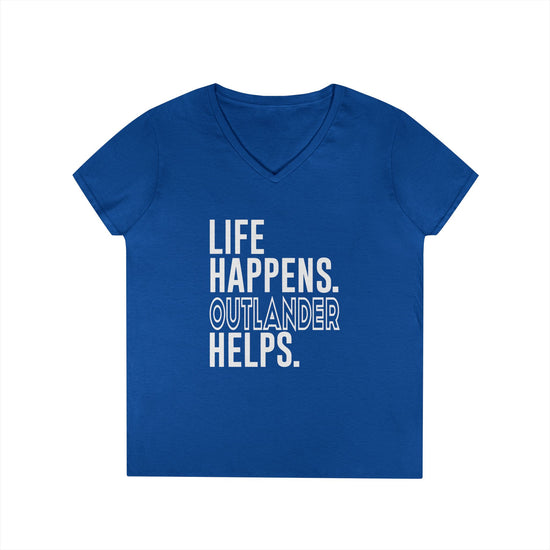 Elevate your wardrobe with our Life Happens Outlander Helps V-neck tee for women! Show your love for the Outlander by Diana Gabaldon every day with this stylish and comfortable t-shirt. Let everyone know that Outlander "helps" you navigate life's daily challenges, and join our community of fandomaniacs who proudly wear their passion on their sleeves.