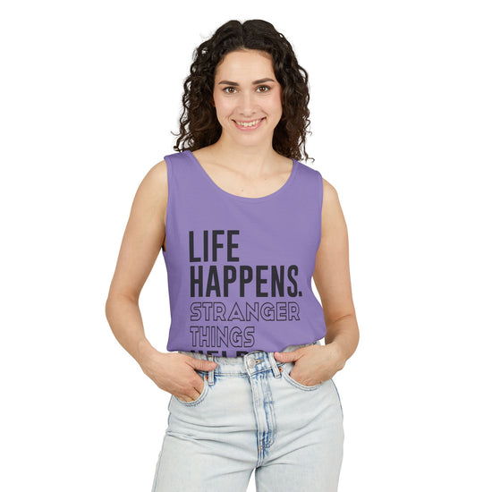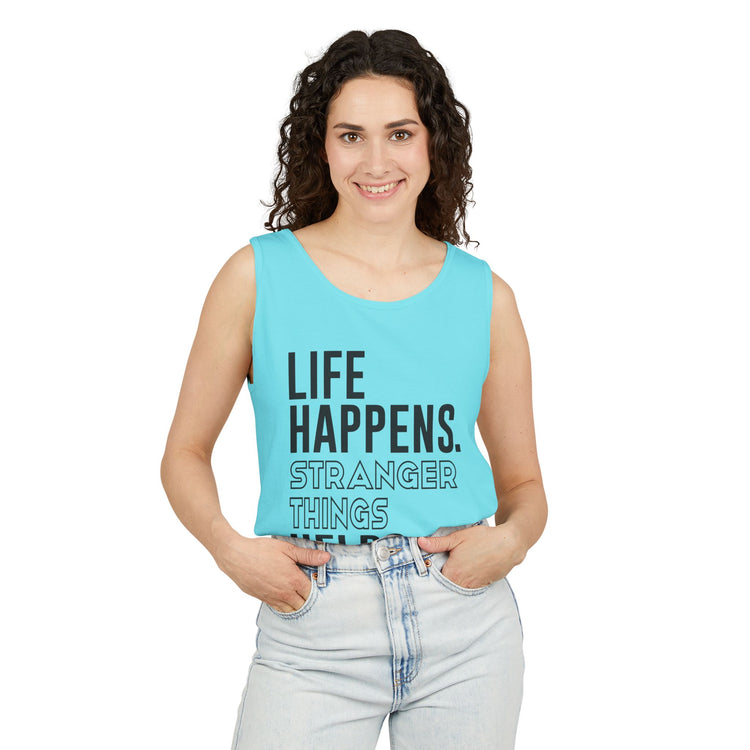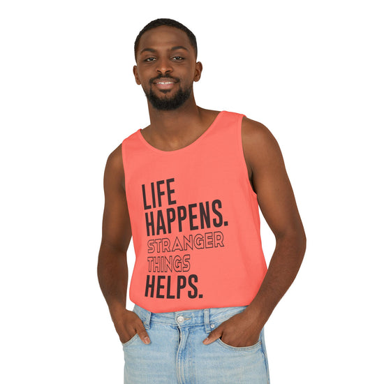 Calling all Fandomaniacs! Let your obsession with Stranger Things shine with our Life Happens Stranger Things Helps tank top. Made for everyday wear, this tank is a must-have for anyone who wants to show their love for the show wherever they go.