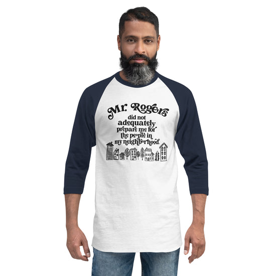 Join the ranks of true Fandomaniacs with our Mr Rogers 3/4 sleeve raglan shirt! This stylish shirt is the perfect way to pay homage to Mr Rogers' Neighborhood and showcase your appreciation for the beloved TV show. With a comfy raglan design and a humorous quote that reads "Mr Rogers did not adequately prepare me for the people in my neighborhood", this shirt is a fun and lighthearted addition to any fan's collection. Treat yourself to this unique piece of fan merchandise and let your love for Mr Rogers shine through every day.