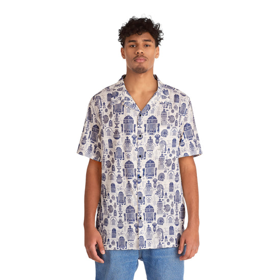 Nothing says "I'm FUN like a Hawaiian shirt, and now, you can own your own R2D2 Hawaiian shirt. Made to have a boxy fit and a notch lapel collar that are perfect for any laidback scenario, these shirts come with a handy chest pocket and a 95% polyester and 5% spandex fabric for silky comfort. Choose between black or white buttons.