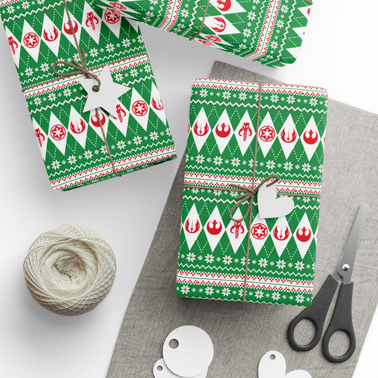 Show off your fandom spirit with our Rebellious Ugly Sweater Wrapping Paper from Fandom-Made.com - because true fans show their love for fandom every day. Perfect for all you fandomaniacs out there, this wrapping paper features a fun and quirky argyle ugly Christmas sweater design adorned with iconic Star Wars symbols. Available in three convenient sizes, this wrapping paper is the ultimate way to elevate your gift-giving game and bring a smile to any Star Wars fan's face. Make every day a celebration of your favorite fandom with our Rebellious Ugly Sweater Wrapping Paper.