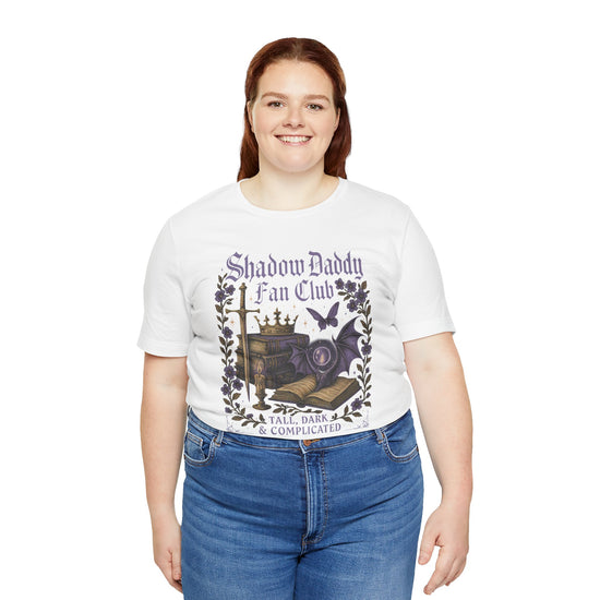Elevate your fan status with the Shadow Daddy Fan Club Unisex T-Shirt from Fandom-Made.com - because true fans show their love for fandom every day. This exclusive design, inspired by The Empyrean Series by Rebecca Yarros, is a must-have for fandomaniacs who want to represent their passion in style. Available in XS to 4XL sizes, this lightweight and comfortable tee is perfect for showcasing your dedication to the series.