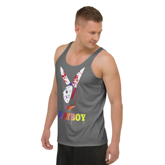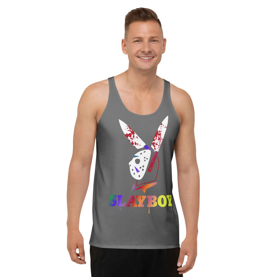 Elevate your summer wardrobe with the Slayboy Pride Tank Top for Men. Show your love for LGBTQIA+ pride every day with this unique design, combining the Playboy logo with Jason Voorhees' iconic goalie mask in a vibrant rainbow color palette. Perfect for Pride month and all fandomaniacs who want to celebrate their favorite movie in style.