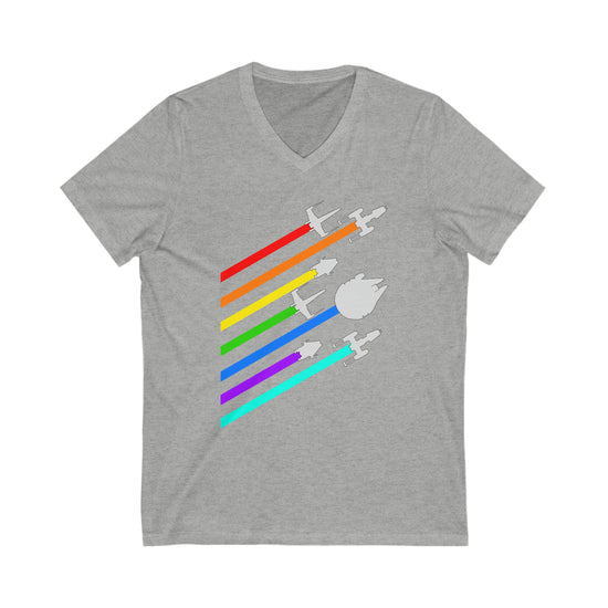 Celebrate Pride Month in style with our Star Wars V-neck tee! Show your support with ships flying with rainbows behind them. May the Force of love and acceptance be with you!