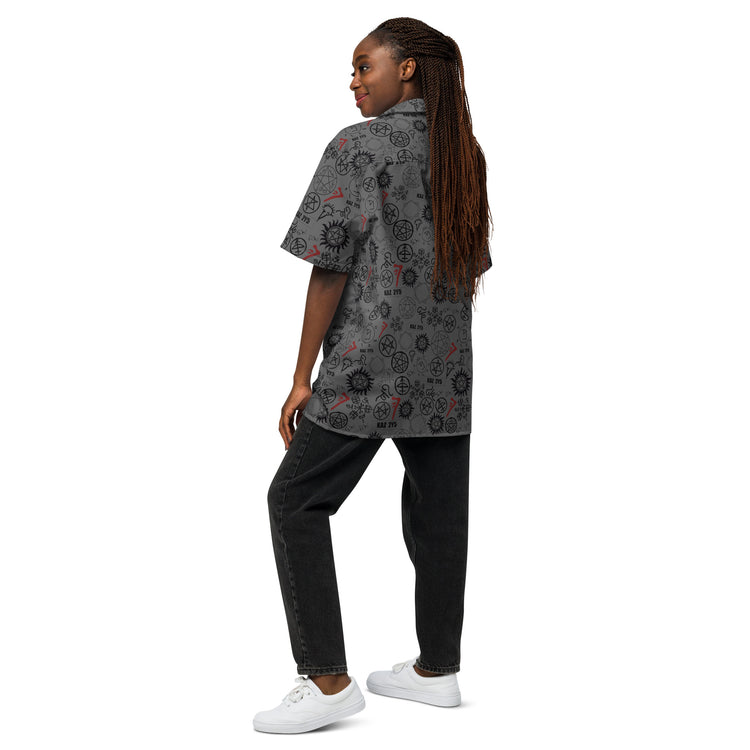 Get ready to flaunt your love for Supernatural with this stylish unisex button shirt featuring iconic symbols like the Mark of Cain and the Anti-Possession sigil. Perfect for any fan!