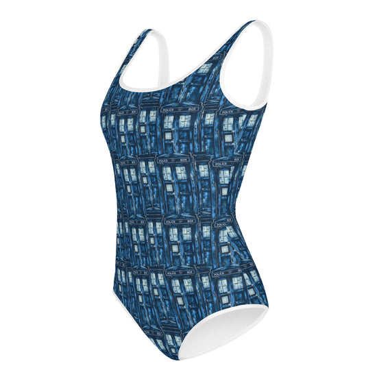 Dive into the time-traveling world of Doctor Who with our Tardis All-Over Print Youth Swimsuit. Made for young fans, this swimsuit features a fun design inspired by the iconic police box.