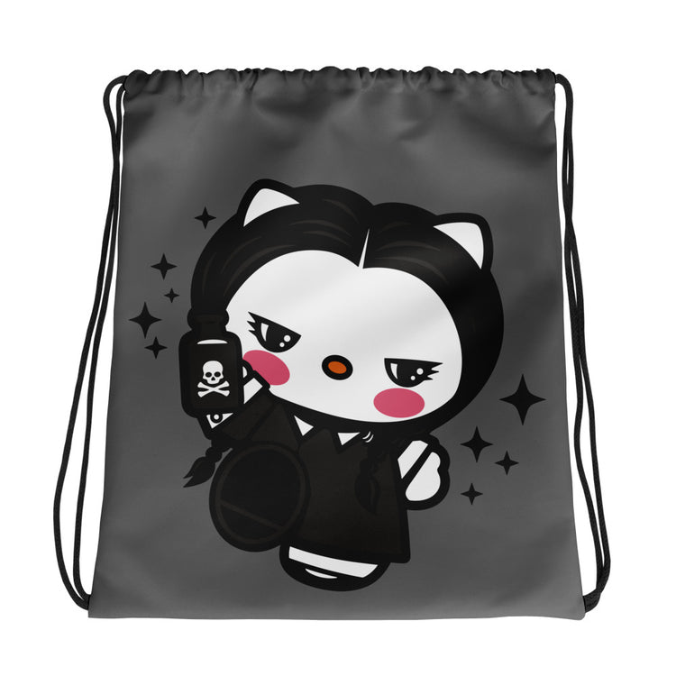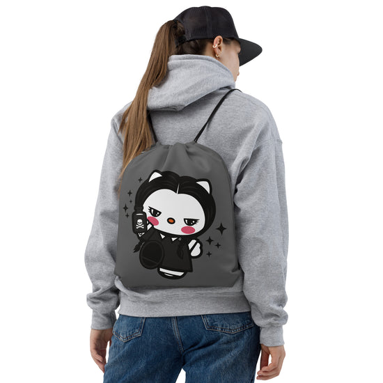 Make a statement with the Wednesday Kitty drawstring bag by Fandomaniacs. Embrace your inner goth while displaying your love for fandom every day with this stylish accessory. The perfect combination of Hello Kitty and Wednesday Addams, this bag is sure to turn heads and showcase your unique style.